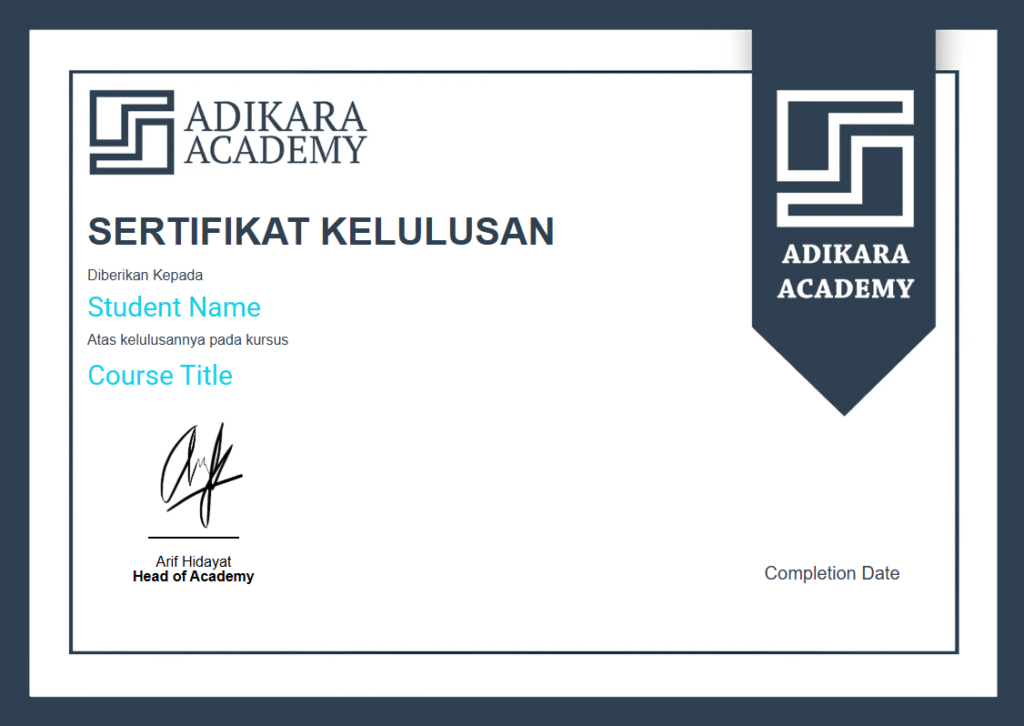 Di Adikara Academy, kami merancang kursus berkualitas tinggi agar setiap pembelajar mendapatkan pengalaman terbaik dan keterampilan yang relevan tanpa hambatan biaya.